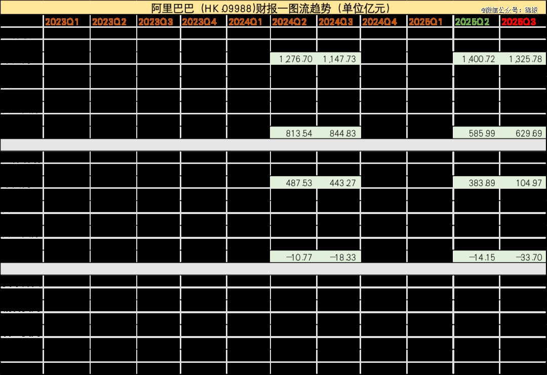 北京时间11月25日,阿里巴巴发布截至2025年9月30日的第三季度业绩。财报显示,阿里巴巴营收达2478亿元,略高于市场预期;经调整ebita却仅为90.73亿元,同比大幅下滑73%;non-gaap净利润为103.52亿元,同比下降72%,低于预期。核心财务数据如下图所示: