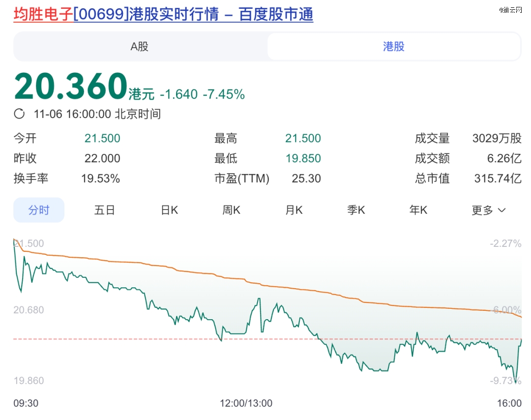 11月6日,宁波均胜电子股份有限公司成功登陆港股市场,发行价22港元/股,开盘跌2.27%至21.5港元/股;截至当日收盘,每股跌7.45%至20.36港元,总市值315.74亿。