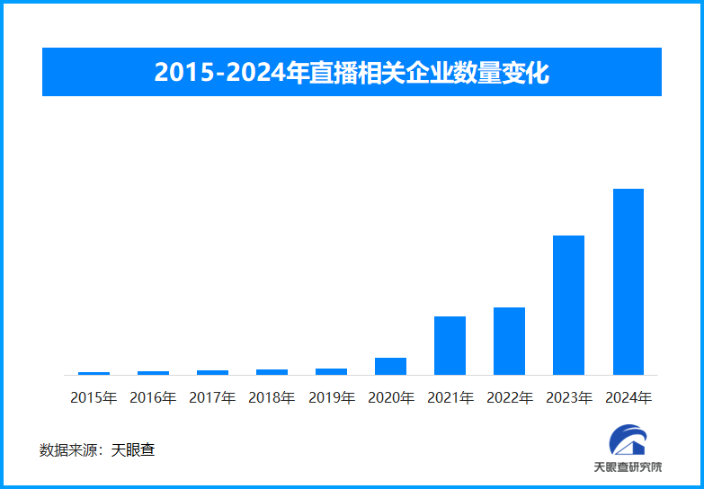 天眼查专业版数据显示,截至目前我国现存在业、存续状态的直播相关企业超227.8万家。其中,2024年新增注册相关企业约82.6万余家,从企业注册数量趋势来看,近十年间,特别是2020年以来,直播相关企业的注册数量呈现出爆发式增长的态势,并在2024年达到顶峰。
