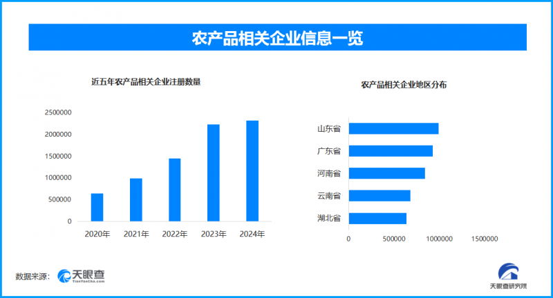 天眼查专业版数据显示,截至目前我国现存在业、存续状态的农产品相关企业超1221万家。其中,2025年截至目前新增注册相关企业约228万余家,从企业注册数量趋势来看,近五年间,农产品相关企业的注册数量呈现出逐年增长的态势,并在2024年达到顶峰。